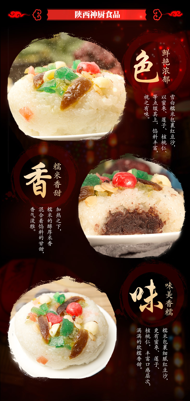 主要生産特色蒸碗、端午粽子(zǐ)、鹵肉制品以及陝西特色小吃食品