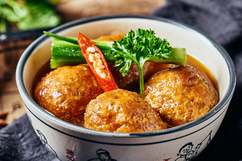 四喜丸子(zǐ)由四個色澤金黃、 香味四溢、形态栩栩如(rú)生的(de)丸 子(zǐ)組成,寓意人生福、祿、壽、 喜。常用于喜宴、壽宴等宴席 中的(de)壓軸菜,以取其吉祥之意。菜品特點:色澤金黃,鮮鹹酥嫩,芡汁清 亮(liàng),味道(dào)适口。